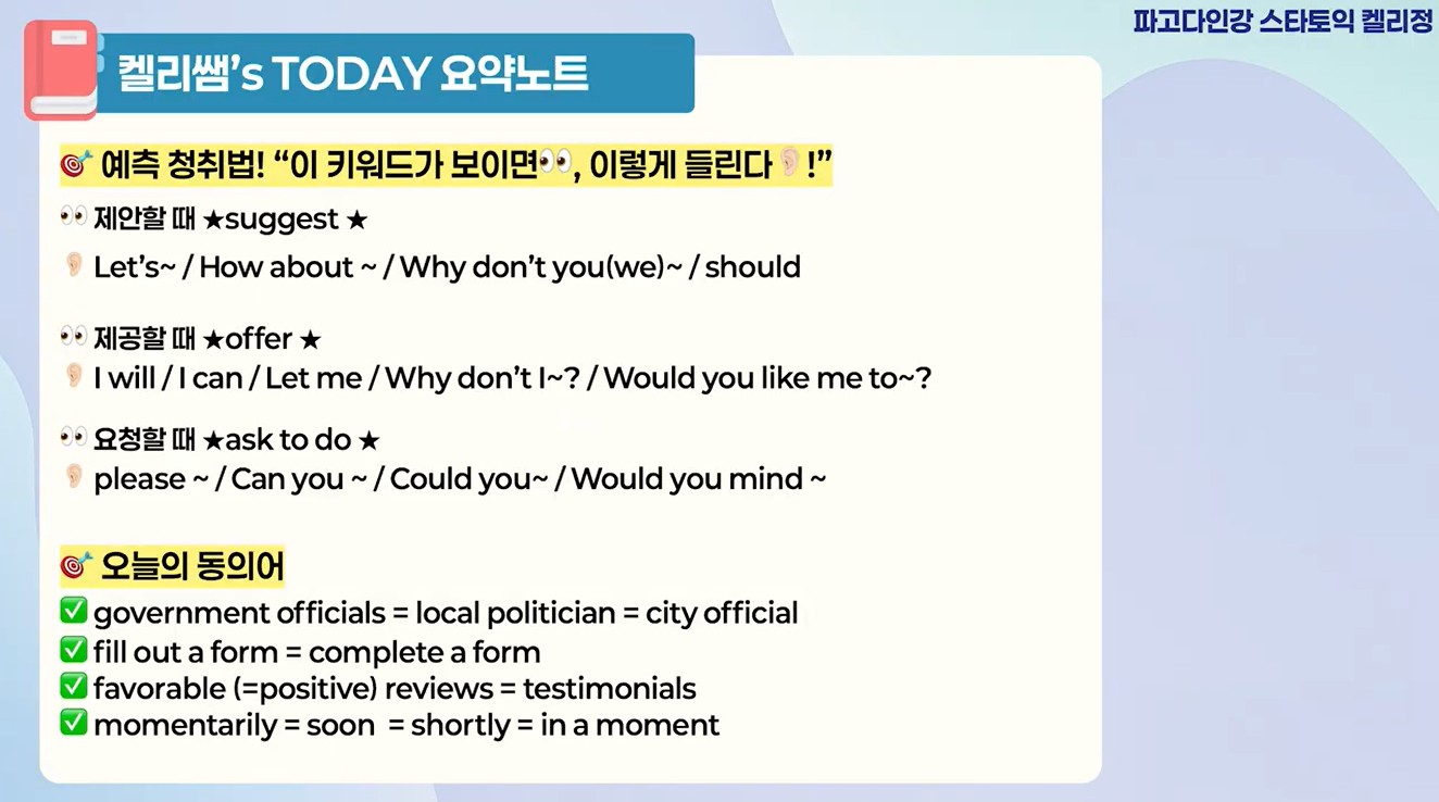 📌강의 특징✔️범위1) 실전 1회분 모의고사2) 파트별 전략 해설 강의3) 최신 기출 트랜드 & 핵심 빈출 표현 리뷰✔️특징1) 정답만 짚어주는 전략형 해설 강의 로 토익 시험 실전 대비 쌉가능!2) 1회분이면 충분!👍 실전 감각 + 고득점 전략 완성!3) 출제 경향 완벽 반영! 점수가 오르는 해설 강의!4) 시험 당일에 써먹는 문풀 전략/핵심 어휘/패러프레이징 자료 제공✔️효과1) 짧고 강력한 1회분 집중 학습으로 부담 없이 몰입도 UP!2) 오답율 높은 문제 유형 + 최신 출제 포인트 정리로 실전 감각 완성!3) 고효율 파트별 해설 강의로 오답율은 줄이고 정답율은 UP!4) 최신 업데이트 토익 모의고사 컨텐츠로 시험 당일까지 완.벽.대.비!😎