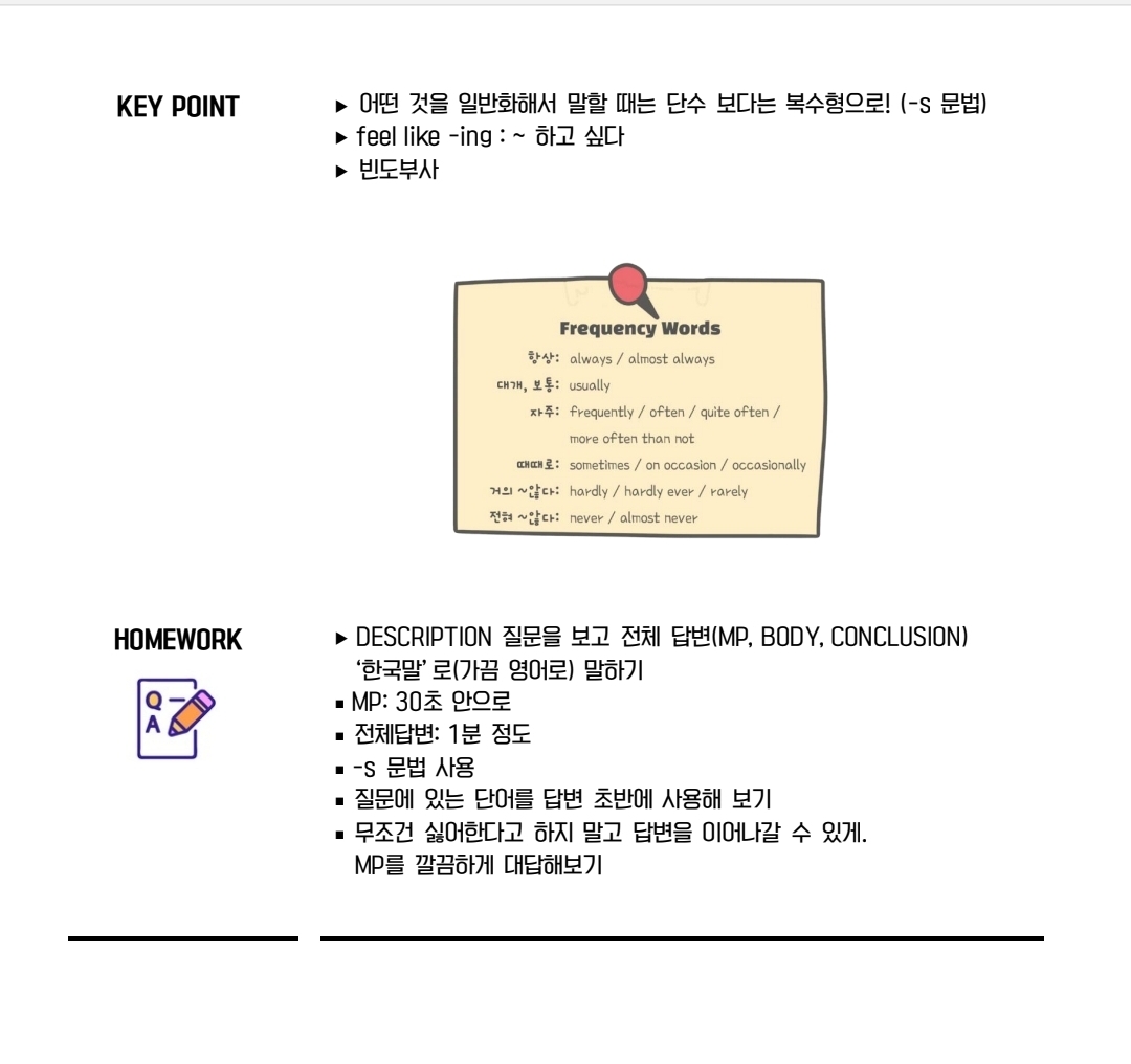 - 입으로 소리내기 : 눈으로 공부하는건 오픽에서 통하지 않아요. 한시간을 공부하더라도 집중해서 계속 입밖으로 소리내 주세요